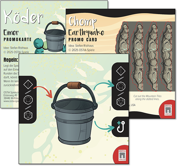 Bei dieser Gelegenheit könnt ihr unsere kostenlosen Promo-Karten zu den Neuheiten erhalten: „Erdbeben“ für Chomp und „Eimer“ für Köder. Beide sind in Deutsch und Englisch und kompatibel mit dem Grundspiel und der jeweiligen Erweiterung.